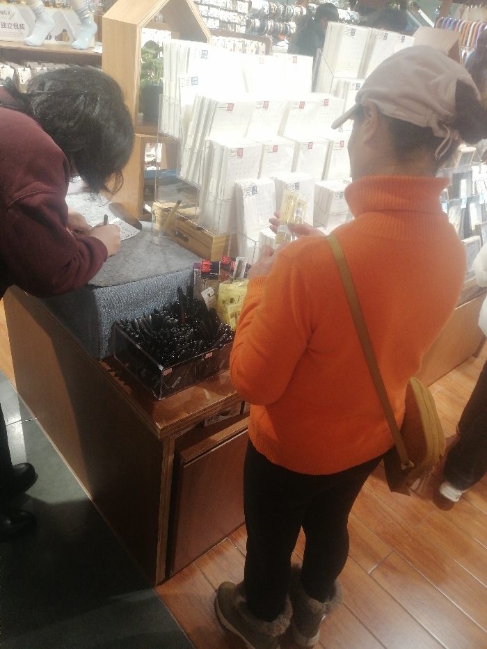 This image depicts an indoor retail setting within the Dongcheng District, China. Two individuals are positioned at a merchandise display counter. On the left, a person with dark hair, dressed in a burgundy long-sleeved top, is leaning over a gray padded counter surface, actively writing on a piece of white paper with a dark pen. To their right, viewed from behind, a second individual stands, wearing an orange turtleneck sweater, black pants, and gray fur-lined boots. This person wears a light-colored baseball cap and a small brown shoulder bag, and is holding two small, clear, cylindrical items in their right hand, appearing to examine them. Between the two individuals, on the wooden counter, a clear rectangular container is filled with numerous black pens. Behind the counter, various white, rectangular items, consistent with stacked stationery or postcards, are displayed on shelves. A wooden house-shaped display case containing a small green plant is visible in the background. The floor on the right is a light wood, transitioning to a darker, possibly carpeted or tiled, section on the left. Other retail displays are visible in the background.
