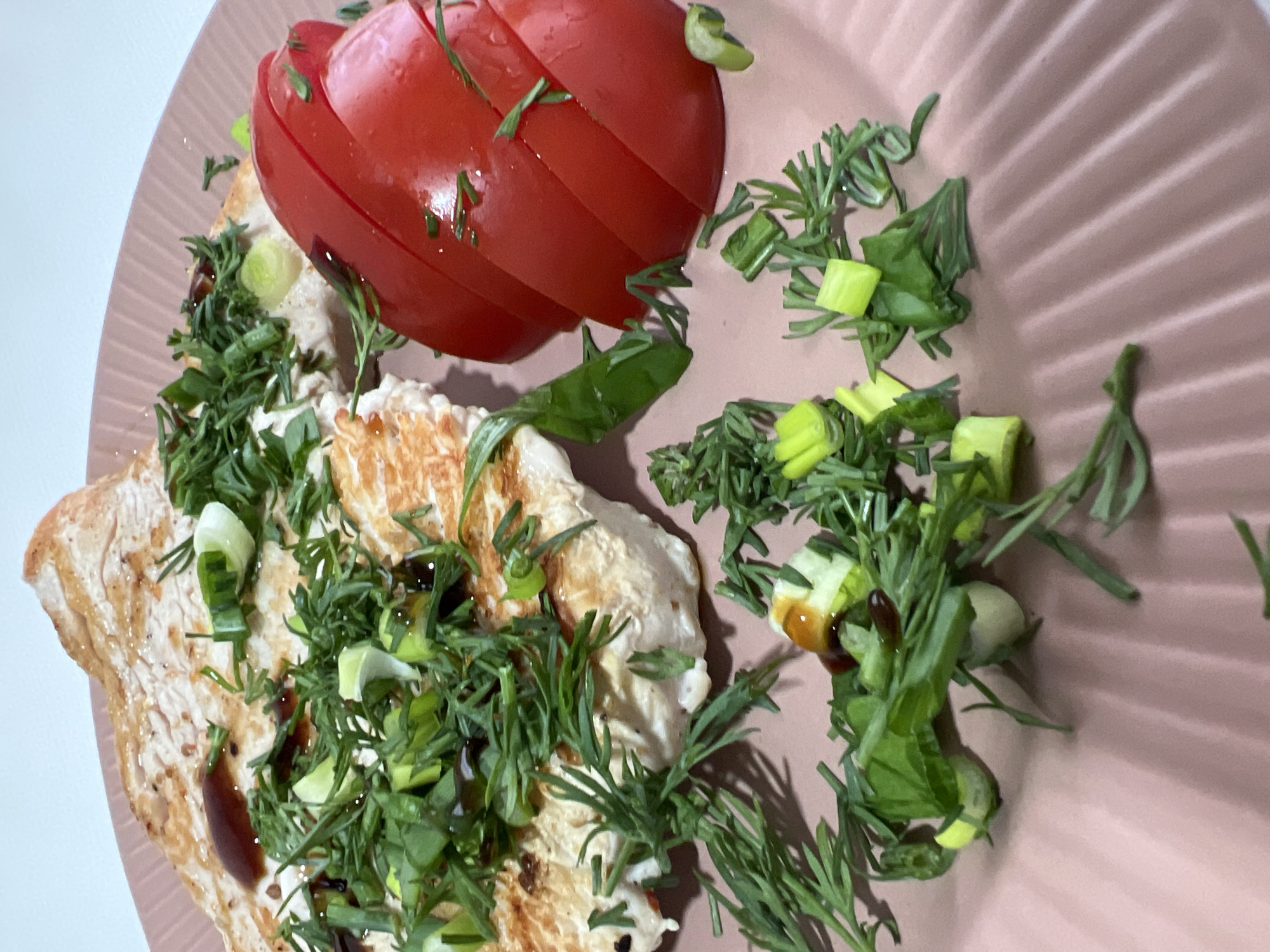 A plate of food is presented on a light pink plate with radial ridges. On the left of the plate is a grilled piece of meat, likely chicken or turkey, garnished with fresh dill and sliced green onions. A halved tomato, sliced partially to create a fan-like appearance, sits beside the meat. The dill and green onions are scattered across the plate, both on top of the meat and in small clumps beside it. A dark sauce is drizzled on the meat and sparsely on some of the herbs. The plate is positioned on a white surface. The scene appears to be indoors under diffused lighting. There is no indication this photo was taken in Chemoshur, Russia, or any other specific location. There is no evidence of people in the image.