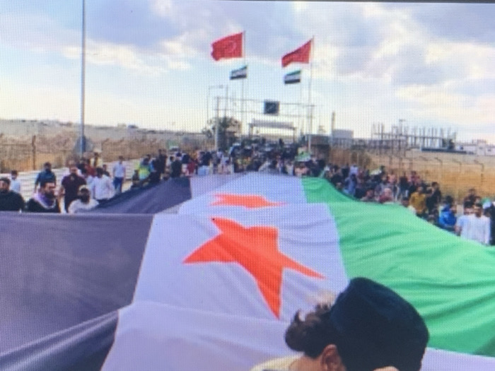 A daytime scene in Al-Mazza Municipality, Syria, depicts a large gathering of individuals, primarily male, holding a vast horizontal flag