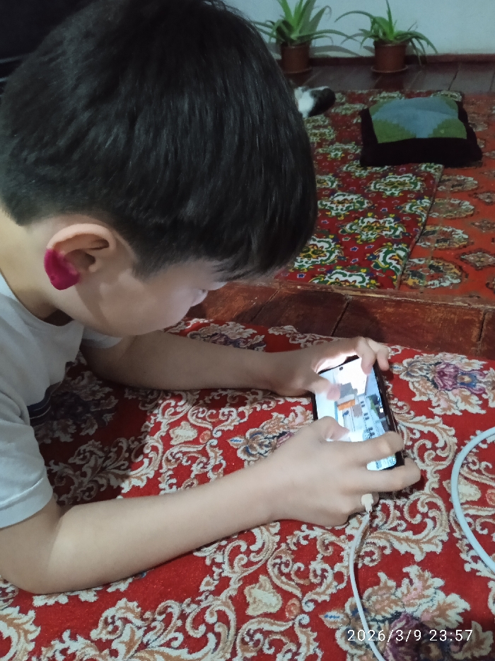 The image depicts an indoor scene in Khujayli, Uzbekistan, captured on March 9, 2026, at 23:57. A young individual with short, dark hair is positioned prone on a vibrant red rug featuring intricate cream and gold traditional patterns. The individual's right earlobe exhibits a distinct reddish-pink coloration. Both hands hold a dark-colored mobile phone horizontally, with thumbs interacting on its brightly lit screen, which displays a digital environment or game featuring architectural elements. A white charging cable is connected to the phone, indicating it is actively charging. In the background, on a slightly raised wooden platform also covered by the rug, two cushions are visible: one predominantly dark with a blue-green upper section, and a second, smaller cushion with a floral pattern. A small, dark-furred animal with white markings is partially visible on the rug behind the individual's head. Against a white wall in the far background, two potted plants with succulent-like leaves are situated on a light-colored surface.