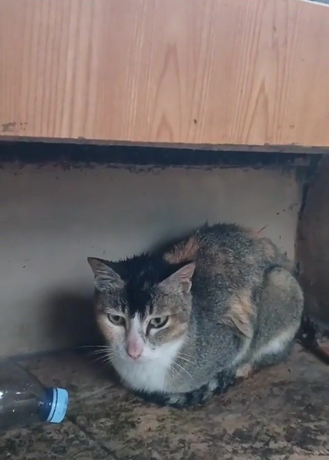 A small, slightly damp calico cat sits on a dirty, mottled floor under a wooden cabinet, next to a clear plastic water bottle with a blue cap