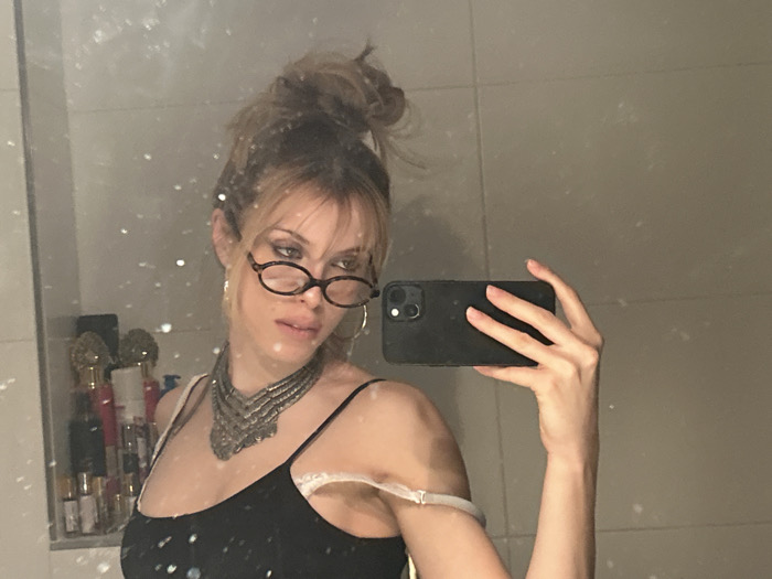The image depicts a female individual taking a mirror selfie indoors. The subject, viewed from the chest up, has light-colored hair styled in an updo with bangs and wears dark-rimmed oval glasses. She is adorned with a prominent multi-layered dark metal necklace and hoop earrings. Her attire consists of a black spaghetti strap top, with a white bra strap visible on her right shoulder (viewer's left). Her right hand holds a black smartphone, positioned to capture her reflection in the mirror. The background, reflected in the mirror, shows a light-colored tiled wall and a shelf on the left holding several bottles, likely toiletries or perfumes. The mirror surface exhibits numerous small specks. The indoor setting provides no specific visual cues to determine a precise location within Pantin, France.