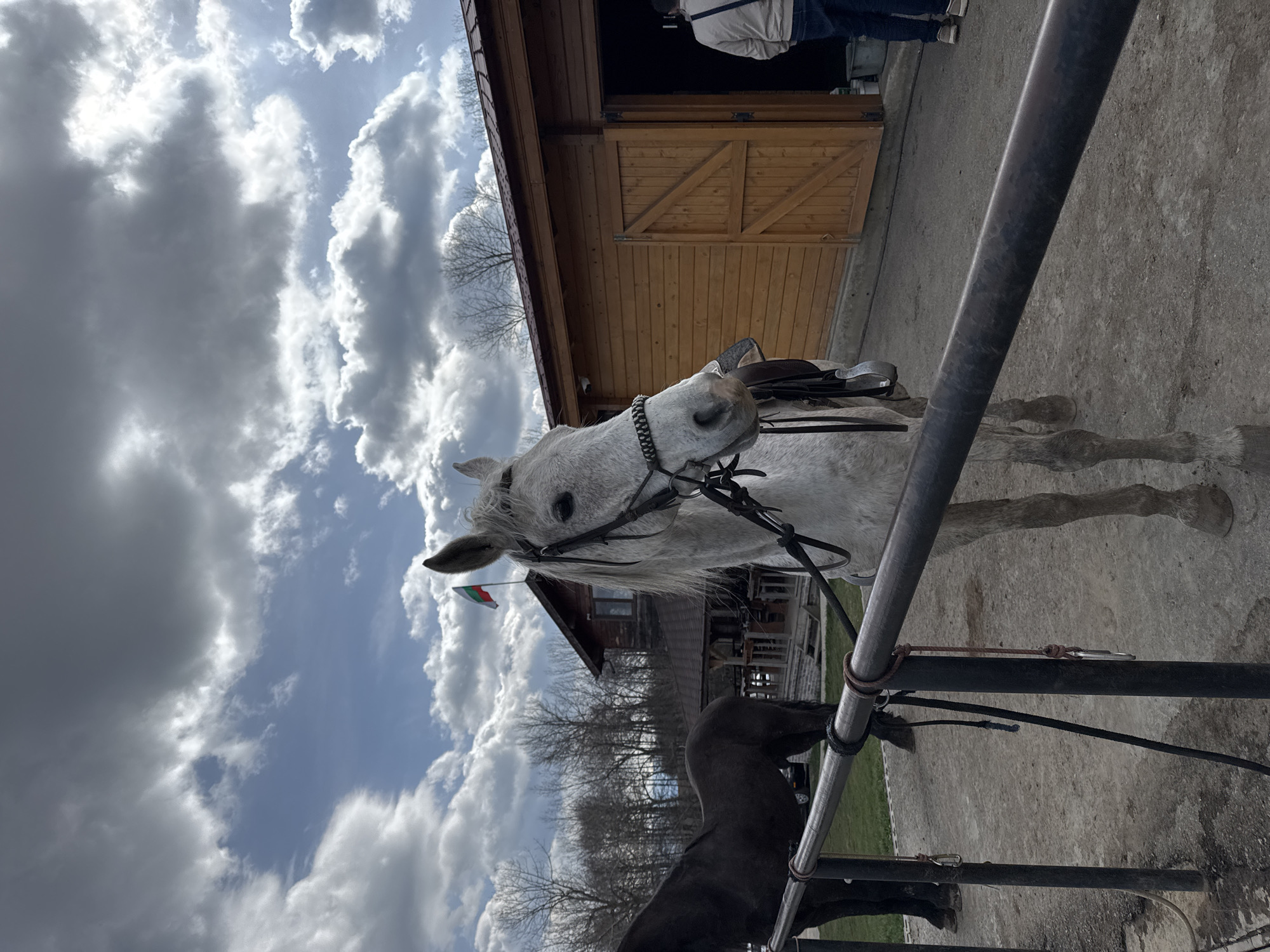 A cloudy sky serves as a backdrop for a partially visible building and two horses standing near a metal fence in Kovachevtsi, Bulgaria. One horse is white, wearing a bridle, with a small Bulgarian flag attached to its ear. The second horse is dark colored. A wooden building is partially visible behind the white horse. People are seen in the background of the image.