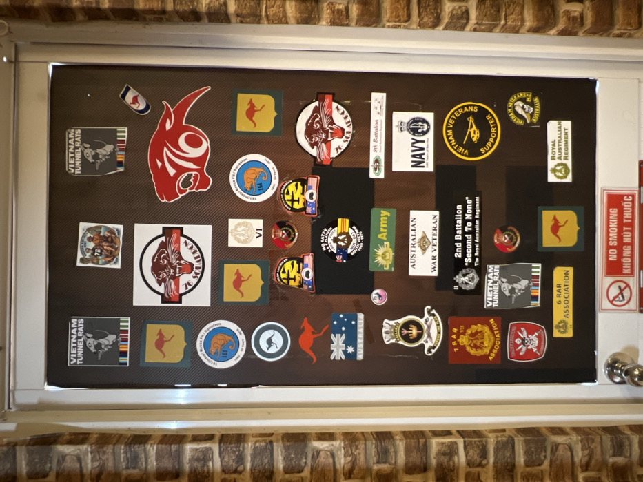 A collection of military-themed stickers adorns a dark surface framed in white. Several stickers reference the Vietnam War, including "Vietnam Tunnel Rats" and "Vietnam Veteran." Others feature kangaroos, representing Australia, with labels like "Army," "Australian War Veteran," and "Royal Australian Regiment." Unit designations such as "9th Battalion," "2nd Battalion," and "6 RAR Association" are also present. A "No Smoking" sign in Vietnamese and English is affixed to the frame, near the doorknob. A sticker bearing the word "Navy" is visible.