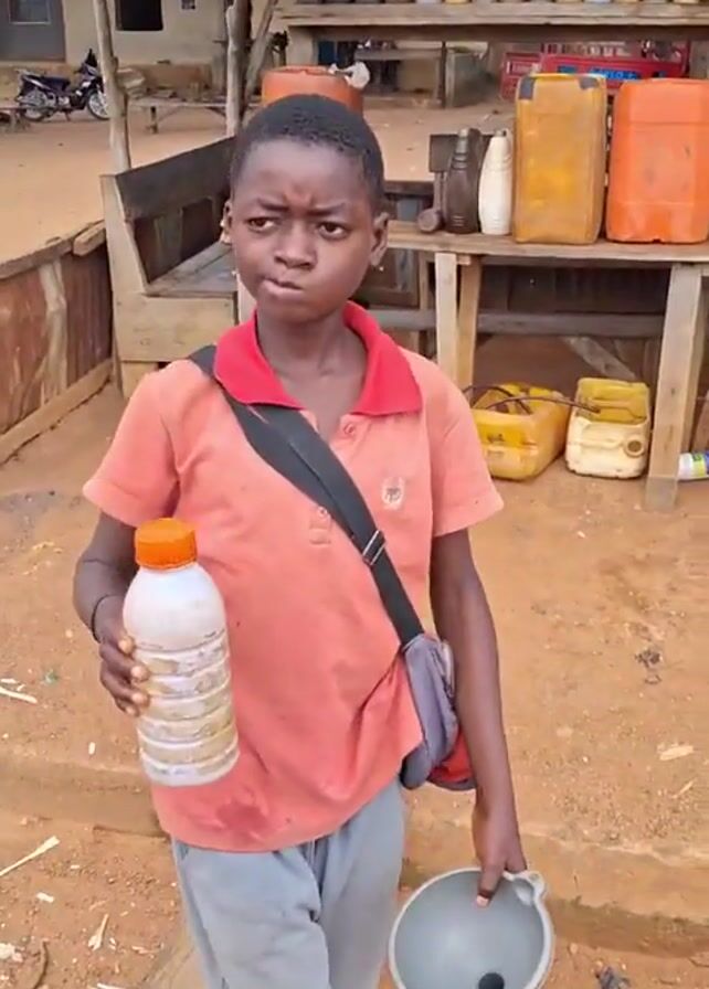 young boy standing on a dirt road near a shop with shelves full of bottles and containers. He is holding a funnel and a bottle. A man approaches him, pointing toward the shop. The boy then walks towards the man, crossing a small ditch using a piece of wood as a bridge. The man is standing next to a yellow and black motorcycle. He opens the gas tank of the motorcycle. The environment appears to be a rural or semi-rural area, with other buildings and trees visible in the background.