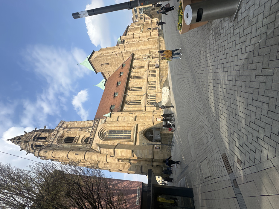 The scene depicts an outdoor urban square in Heilbronn, Germany, dominated by St. Kilian's Church (Kilianskirche). A street sign reading "Kirchbrunnenstraße" is affixed to a building on the far left. The prominent structure is St. Kilian's Church, a large building constructed from light-colored stone. It features a tall, ornate Gothic tower with a spired roof on the left, characterized by multiple levels, buttresses, and visible gargoyles. Towards the right, a second, squarer tower with a green, pyramidal roof is present. The main body of the church exhibits a reddish-brown tiled roof with several small dormer windows and multiple arched, elongated windows along its facade. A raised stone platform, accessible by stairs, is situated at the base of the church, featuring a large, light-colored sculpture or monument. The ground in the foreground and midground is paved with light grey interlocking pavers laid in a herringbone pattern. Sunlight originates from the upper right, casting distinct shadows across the paved surface and from individuals. The sky is blue with scattered white cumulus clouds. On the far left, a modern building with dark reflective windows and a dark overhang is partially visible. Bare tree branches extend into the upper left frame. A tall, dark grey cylindrical street light pole stands vertically on the right side of the image. In the lower right, a large, light-brown planter contains green foliage and a stainless steel waste receptacle integrated into its side. Approximately fifteen to twenty individuals are distributed throughout the square. Most are engaged in walking. In the mid-right, two individuals are walking towards the observer; one wears a yellow jacket and blue jeans, the other a white top and blue jeans. Near the main entrance of the church on the left, a group of five individuals is standing, two of whom are positioned near a white cargo bicycle. Additional pedestrians are visible in the background, near the church or further buildings. Several bicycle racks or parked bicycles are discernable near the church entrance area.