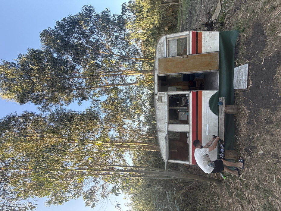 A vintage camper sits amidst trees under a bright sky. Its white and orange exterior is weathered, with open windows and a doorway revealing the interior. A man, wearing a white shirt and dark shorts, stands beside the camper, seemingly working on it. Green fabric covers the base of the camper and a wood plank appears to rest on a tree stump nearby. The surrounding area shows signs of outdoor activity or storage.