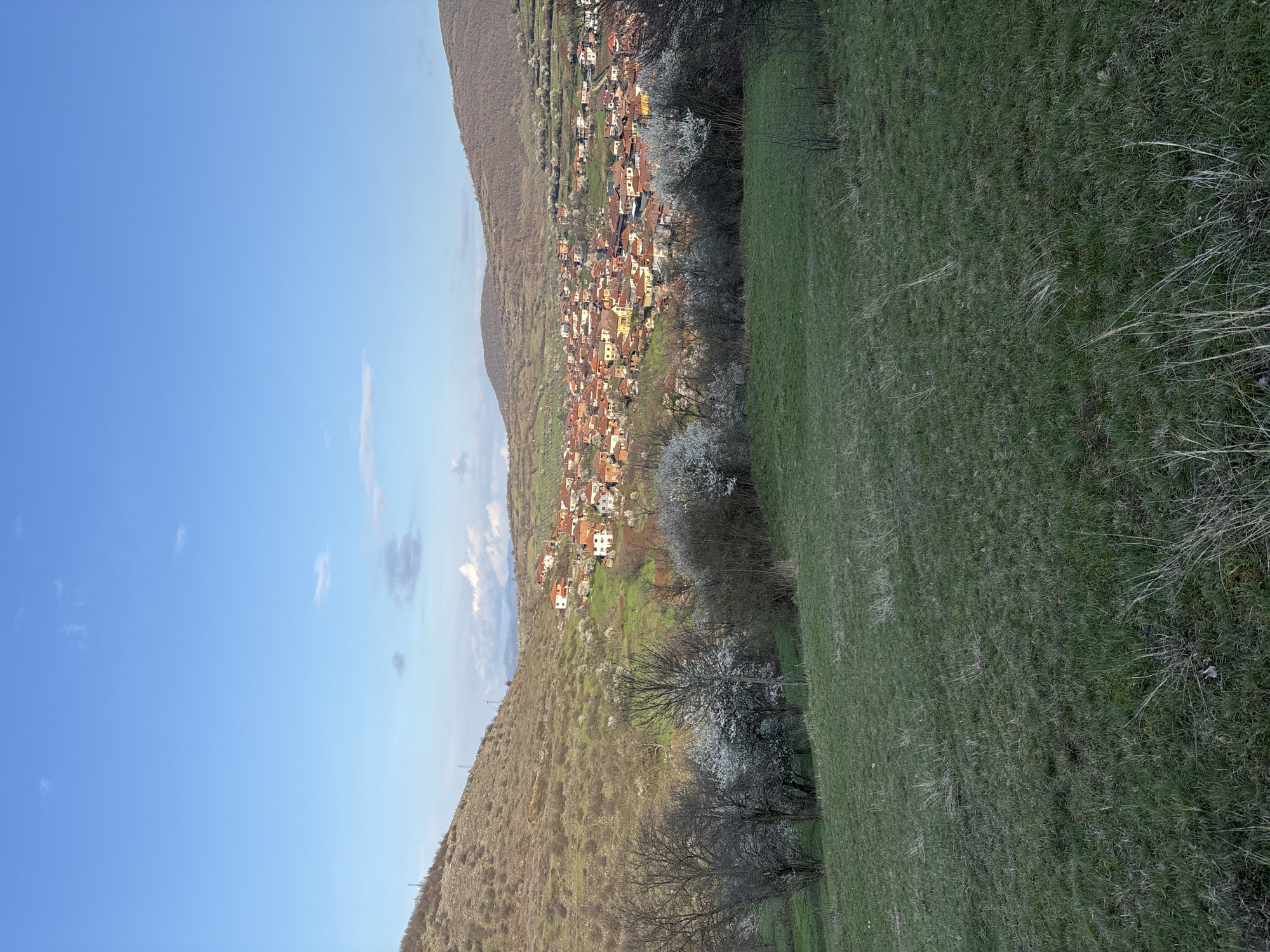 hillside village in Galata, Bulgaria. The village is nestled along the slope of a mountain with brown vegetation. The buildings have red roofs. To the right of the village is a green field with tall grass and a line of trees. The sky is blue with some white clouds. The image is taken from a slightly elevated position.
