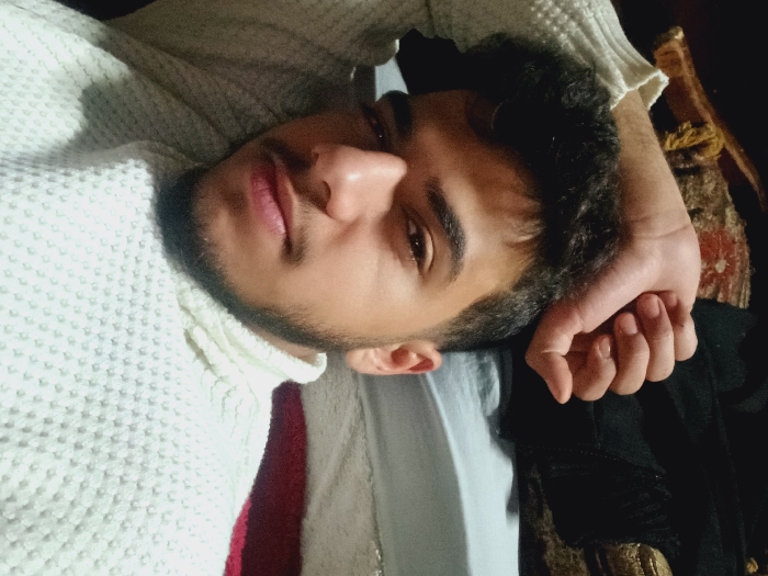 A young man with dark hair and a beard lies on a bed or surface. He wears a white, textured sweater with a turtleneck collar. His right hand is raised near his head. The background includes bedding, and the right side of the image is darkened. The image appears to be taken at an angle, possibly a selfie.