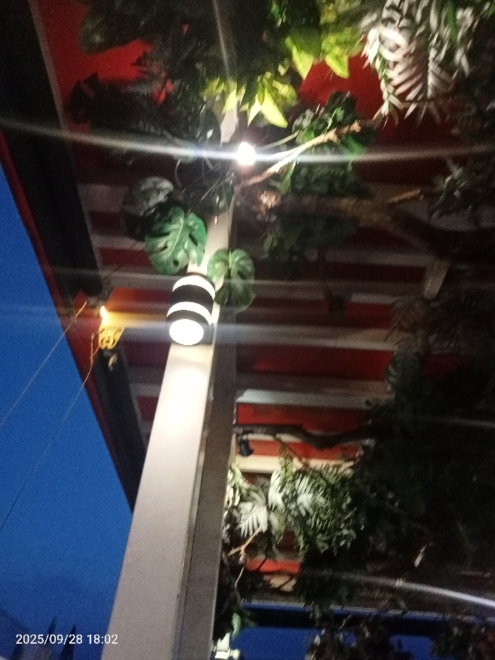 The image, captured on 2025/09/28 at 18:02 in Waso ward, Kenya, displays a decorated outdoor or semi-outdoor architectural space during twilight. A white vertical column occupies the central-left foreground, supporting a horizontal white beam. Attached to this beam is a cylindrical light fixture, black with two horizontal white bands, which emits a bright white light downwards. Numerous artificial plants, including large green split-leaf philodendron-like foliage and other assorted green and lighter-toned plants, are suspended from an overhead structure positioned behind and above the column. This overhead structure features red sections accented with horizontal white stripes. An additional, smaller illuminated light source is visible higher up among the foliage. The sky on the far left is dark blue, indicating the evening hour. No individuals, specific actions, or interactions are discernible.