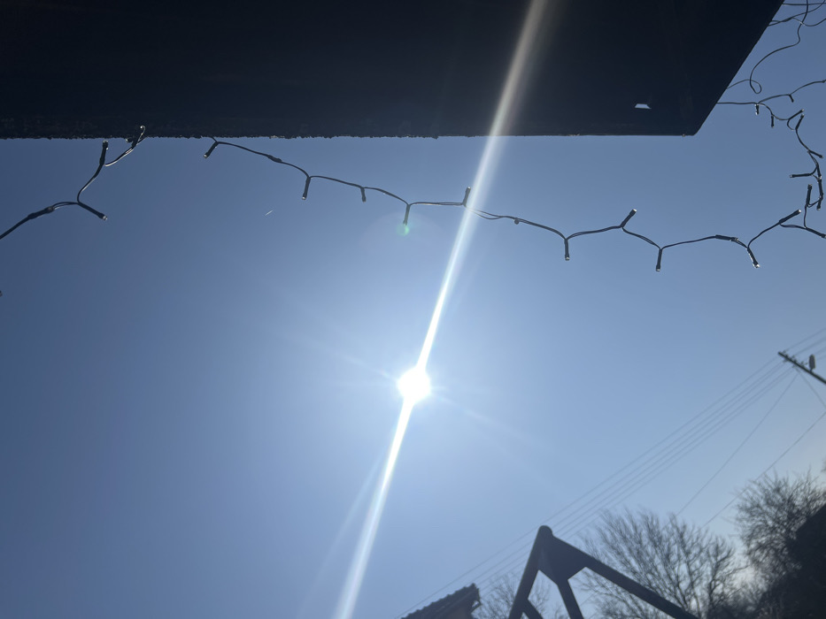 The image depicts an outdoor scene in Gurkovo, Bulgaria, under a clear, bright blue sky. The sun, a prominent light source, is positioned in the lower-left quadrant, producing significant lens flare and radial light rays extending across the frame. To the right, a dark, textured vertical structure, possibly a building facade or roof edge, occupies approximately one-third of the image width. Hanging vertically from this structure is a string of decorative lights, featuring numerous small, unilluminated bulbs suspended by dark wires. In the lower-left background, silhouetted against the bright sky, are several bare deciduous trees with visible branches. Above and slightly to the right of these trees, a utility pole with multiple overhead power lines is visible, extending upwards from the bottom edge of the frame. A dark, angular structural element, possibly part of a building or scaffolding, is also present in the upper-left, partially obscured. A faint, thin white contrail from an aircraft is discernible in the upper-right portion of the sky. No individuals or direct interactions are visible.