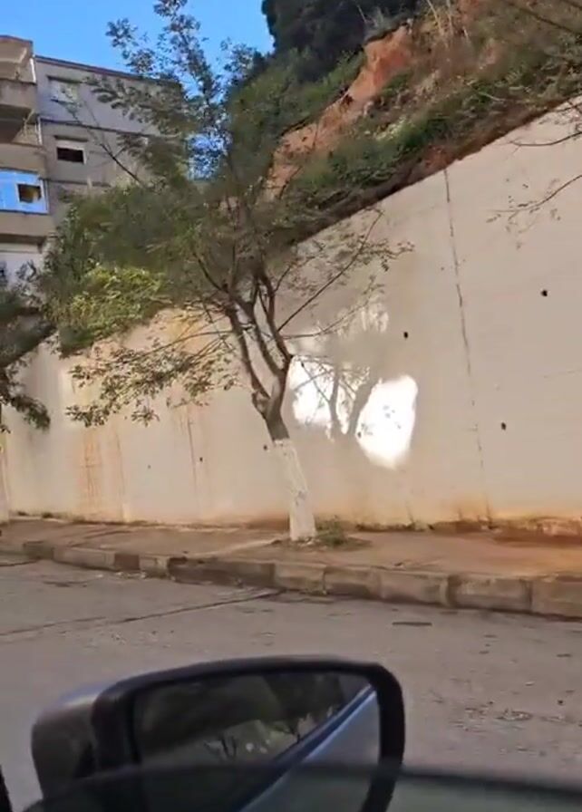 view from inside a car driving along a street. On the right side of the street is a high, white wall, stained with what appears to be water marks. There are a few small trees planted in front of the wall, their trunks painted white at the base. Above the wall is a hillside covered in dense greenery. On the left side of the street, a grey apartment building is visible. The road itself is paved but appears worn. A car's side mirror is visible in the foreground, providing the perspective. The sky is blue.