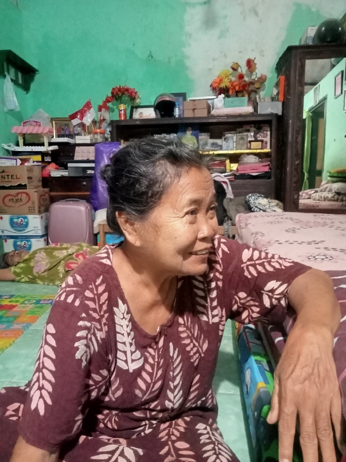 An older woman in a maroon dress with white leaf patterns is kneeling on the floor. Her hair is pulled back. She is smiling and looking to her right. Behind her is a shelf filled with items, including a helmet, flowers, and boxes. A person is lying on the floor in the background. A patterned rug and a bed are also visible. The walls are painted a teal color.