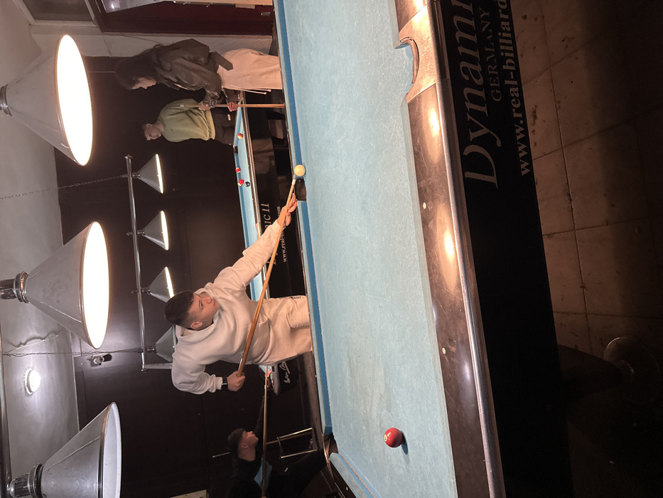 The scene depicts an indoor pool hall in Kyustendil, Bulgaria, where four young individuals are present