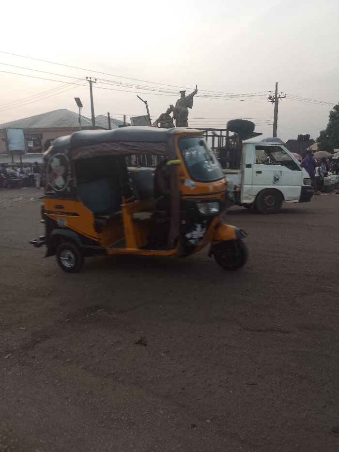 A yellow auto rickshaw sits parked on a dirt road. Behind it is a white truck with a black tire on the back. In the distance, a statue stands atop a structure. The sky is overcast. There are buildings to the left and people gathered. A power line runs across the top of the frame.