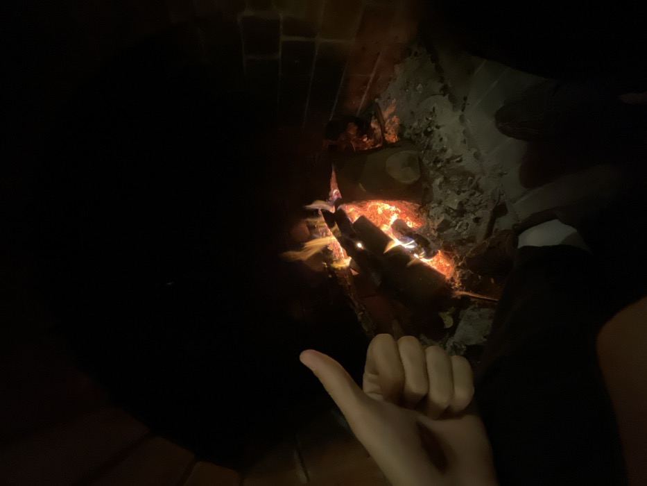 A dim, low-angle view into a brick fireplace reveals burning logs amidst ashes. The fire emits an orange glow, illuminating the rough texture of the brick. A hand gives a thumbs-up gesture in the foreground, its skin tone barely visible in the dim light. Dark shadows envelop the surrounding areas, creating a stark contrast with the bright fire. The composition is framed by the unseen edges of the fireplace.