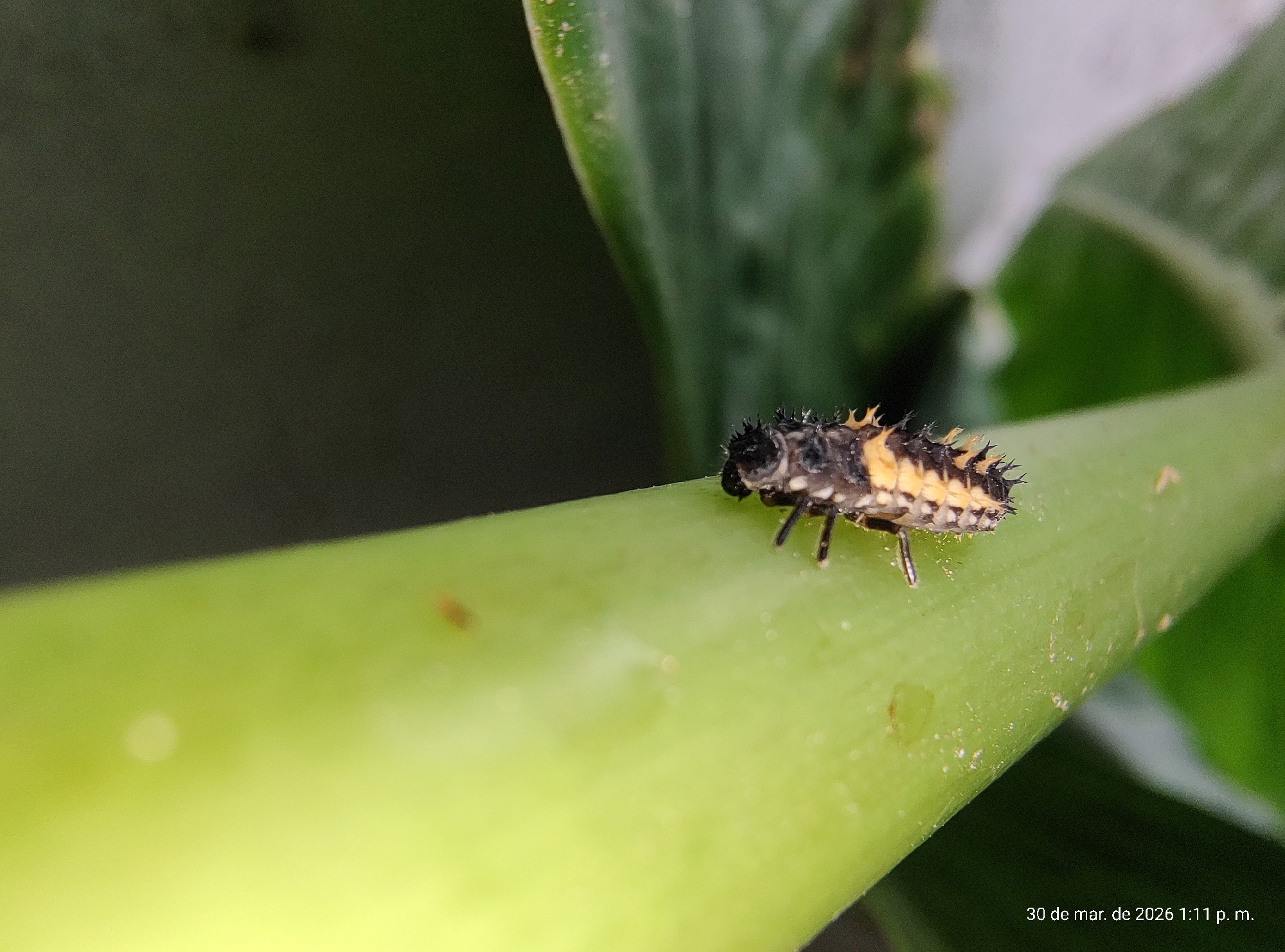 A close-up photograph depicts a small insect larva on a green stem or vine. The larva has a dark, possibly black, head and thorax, with a segmented abdomen featuring black and yellow markings. The larva has spiky protrusions along its body. The background includes blurred green foliage, indicating a natural outdoor setting. The photograph was taken on March 30, 2026, at 1:11 p.m. The location of the image is implied to be Wilde, Argentina, based on prior information. The precise action is the insect resting or crawling on the stem.
