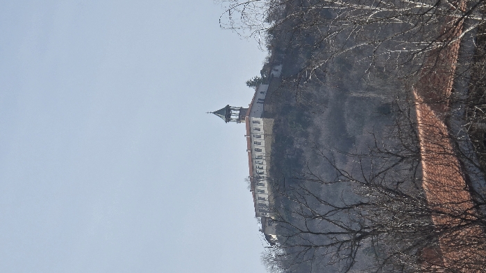 The image displays a large, light-colored building complex situated on the crest of a prominent, tree-covered hill. The main structure features a prolonged, multi-windowed facade with a reddish-brown tiled roof. A distinctive bell tower or ornate cupola, characterized by a dark, pointed spire and an open, multi-arched upper section, rises from the central-right portion of the building. The hill is densely forested with bare deciduous trees, suggesting a winter or early spring season. In the immediate foreground, the leafless branches of trees partially obscure the reddish-brown tiled roofs of additional, lower-lying structures. The sky above is clear and light blue. No individuals or specific actions are present in the scene. Location: Unknown, Unknown.