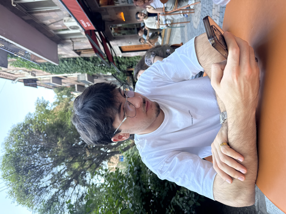A young adult male with dark hair, a light beard, and rectangular glasses sits at an orange outdoor table, his forearms resting on the surface