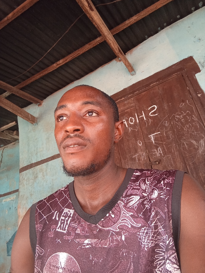 A man is looking off to the side, facing left. He has a shaved head, a small beard, and brown eyes. He's wearing a maroon and white patterned tank top with a black neckline. The background includes corrugated roofing and wooden beams, a pale blue wall, and a weathered brown door with faded white writing on it. The overall scene has a slightly gritty and rustic aesthetic.
