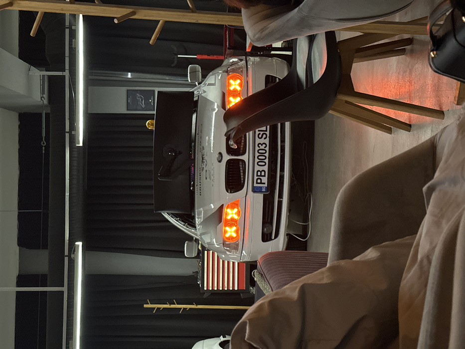 The image captures an indoor automotive facility in Plovdiv, Bulgaria, identified by the "PB" prefix on the license plate. A white BMW E39 sedan is centrally positioned, facing the viewer, displaying Bulgarian license plate PB 0003 SL. Its headlights are actively illuminated with distinctive orange "X" shaped patterns. A dark, rectangular panel, potentially a screen or protective cover, rests on the vehicle's hood, topped by a small yellow beacon light on its upper right side. Wires are visible extending from beneath the front bumper onto the light-grey concrete floor. The background features dark curtains lining the back wall and linear fluorescent light fixtures on the ceiling. To the left of the BMW, a red multi-drawer tool chest is visible, accompanied by a light-colored wooden coat rack and a partial view of another white vehicle. To the right, another wooden coat rack and a framed diagram mounted on a dark wall are present. The scene is photographed from a seated perspective within a foreground lounge or waiting area. A beige upholstered armchair occupies the left foreground, partially obscuring a person's leg and arm. A modern black chair with light wooden legs is prominently positioned on the right, reflecting the orange light from the BMW's headlights onto its seat and the floor. A portion of a grey upholstered chair and a dark handbag are also visible on the far right. No individuals are clearly depicted beyond the partial view in the armchair.