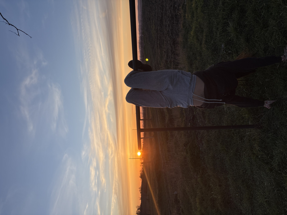 The image depicts a rural scene at sunset in Kiosevtsi, Bulgaria. A single individual is captured performing an inversion, hanging upside down by their legs from a dark-colored horizontal bar. The person is dressed in light grey sweatpants with a visible drawstring and a dark top that is partially ridden up. Their head and upper torso are not visible, being below the bar, while their legs are bent with dark footwear visible on their feet. The horizontal bar, supported by at least one vertical post, is positioned in the middle ground. The background features a broad expanse of open, grassy land, transitioning into what appears to be tilled or cultivated fields further right. On the left horizon, a line of distant trees or vegetation is silhouetted against the sky. The setting sun, a prominent bright orange disc, is visible on the left horizon, casting strong golden light rays horizontally across the lower left quadrant of the image. The sky above displays a gradient of colors from light blue at the zenith to vibrant oranges, yellows, and reds near the horizon, accented by thin, elongated clouds illuminated by the sunset. A bare tree branch is visible extending into the upper right corner of the frame.