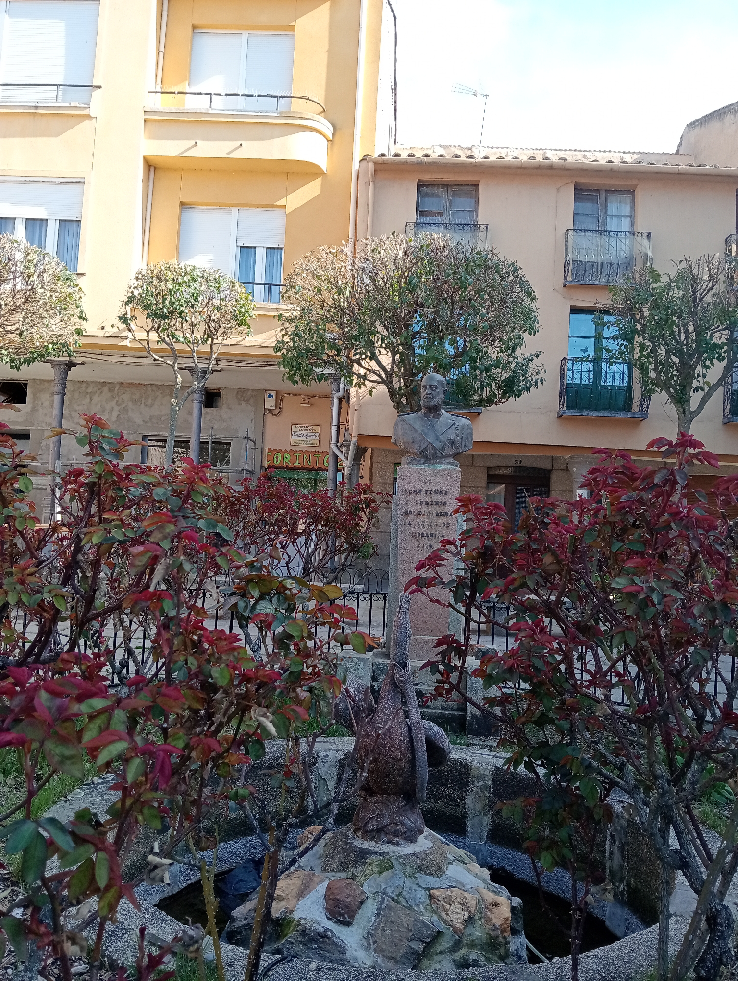The image displays a public space in Piedrahíta, Spain, under bright daylight. A bronze bust of a bearded male figure, wearing a military-style uniform with epaulets and a sash, stands on a light gray stone pedestal. The pedestal bears an inscription in Spanish, including the names "REINA" and "PIEDRAHITA." Surrounding the monument is a low, circular planter or fountain structure built from irregular stones and concrete, filled with rose bushes displaying prominent red and green leaves. A dark, gnarled, abstract sculptural element, possibly organic, rises from the base of this structure. A low black metal fence encloses the immediate area around the planter. In the background, a three-story, light yellow building on the left features multiple rectangular windows, some with closed white roller shutters, and a curved second-floor balcony with a dark railing. A partially obscured commercial sign is visible on its ground floor. To the right of the monument, a two-story, light beige building presents traditional windows with dark iron balconies. The address number "310" is affixed above a dark entrance door. An adjacent building section to the right exhibits an exposed concrete facade with visible scaffolding and a partial "CORINTO" sign. Sparse deciduous trees with minimal foliage are distributed between the monument and the buildings. No individuals are present in the scene.