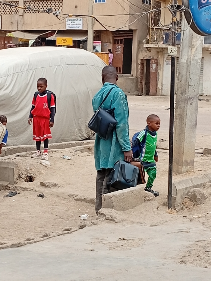 The image depicts an outdoor urban scene in Sabon Gari West, Nigeria. In the midground, an adult male stands facing away from the viewer, wearing a teal long-sleeved garment over dark trousers. He carries a dark shoulder bag on his left shoulder and holds a dark rectangular bag with handles in his left hand, resting it on a concrete block. To his left, a boy, estimated to be 5-8 years old, stands on an elevated dirt patch wearing a red short-sleeved top, matching red shorts, a black backpack, and light-colored sneakers; he looks towards the left. To the adult's right, a younger boy, estimated to be 3-6 years old, stands on lower dirt ground, dressed in a green and black long-sleeved top, matching green trousers, dark shoes, and a blue backpack; he looks towards the right. A partial view of a fourth child is visible on the far left. The ground is predominantly uneven, light brown dirt with scattered debris and irregular concrete sections. In the mid-left background, a large, rounded structure is covered by a light-colored tarp. Behind this, a light-colored multi-story building features a sign reading "JEROMA FAMILY HEALTH CARE MEDICALS" and "Home Treatment Available," with a yellow rectangular sign positioned below. To the right, another multi-story building shows signs of wear and disrepair. A grey utility pole on the right side of the frame supports numerous tangled electrical wires and a blue circular sign, partially visible. Faint figures are discernible within the open doorways of the background buildings.