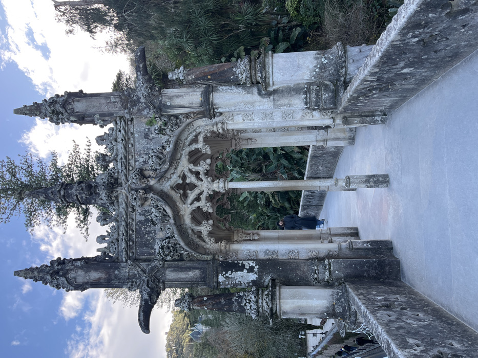 An intricately carved stone structure dominates the frame. Its Gothic architecture is emphasized by pointed arches, ornate detailing, and lichen-covered surfaces, suggesting age and weathering. A figure in dark clothing stands within the structure's open space. Lush greenery peeks through the openings and surrounds the site. The sky, with scattered clouds, forms a backdrop. The scene conveys a sense of history, architecture, and peaceful solitude.