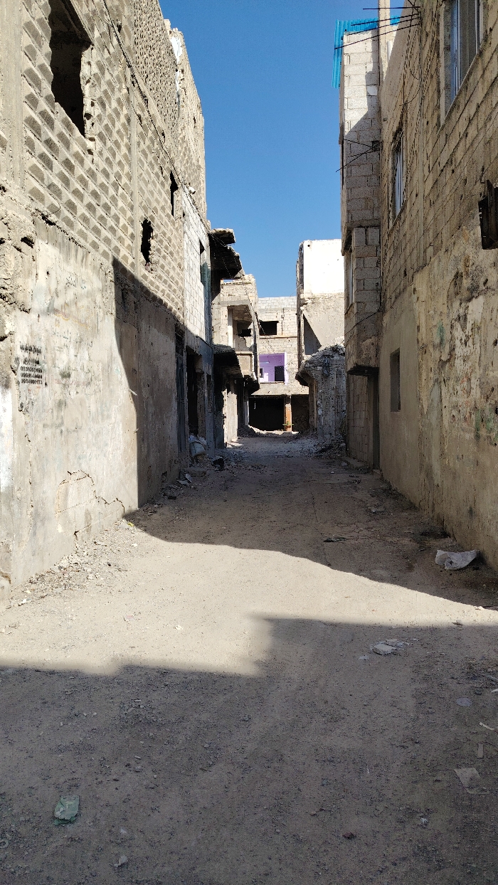 - "The image depicts a deserted, narrow alleyway within the Al-Qaboun Municipality, Syria, characterized by extensive structural damage to the surrounding buildings under a clear blue sky" by FM-YWUCQ2, licensed under CC BY 4.0