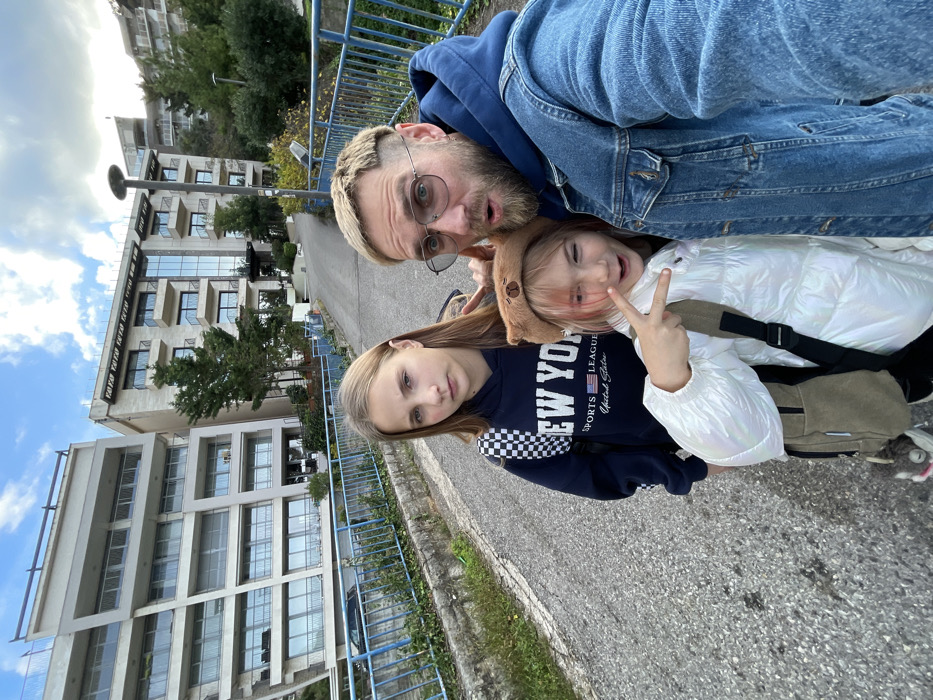 A man and two girls pose for a selfie outdoors. The man wears glasses, a denim jacket, and a blue hoodie. One girl wears a navy sweatshirt with a checkered sleeve and the words "NEW YORK". The other girl wears a white puffer jacket and a brown animal ear hat while making a peace sign. A building and trees are visible in the background. The photo is taken on a paved surface with a blue railing visible.