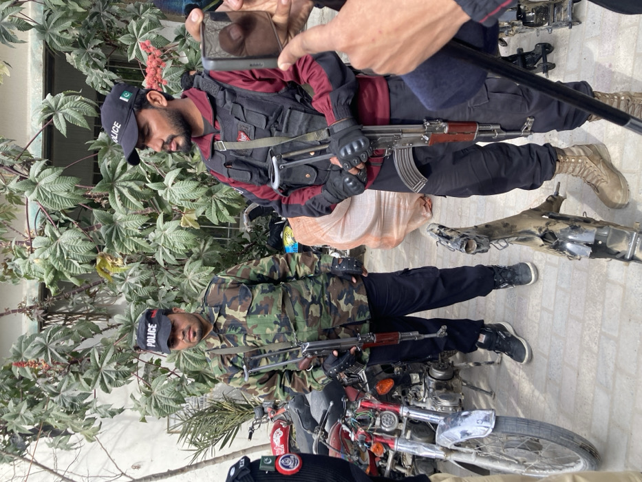 The image captures an outdoor scene in Quetta City Tehsil, Pakistan, showing two armed individuals in police attire, other personnel, motorcycles, and damaged metallic components