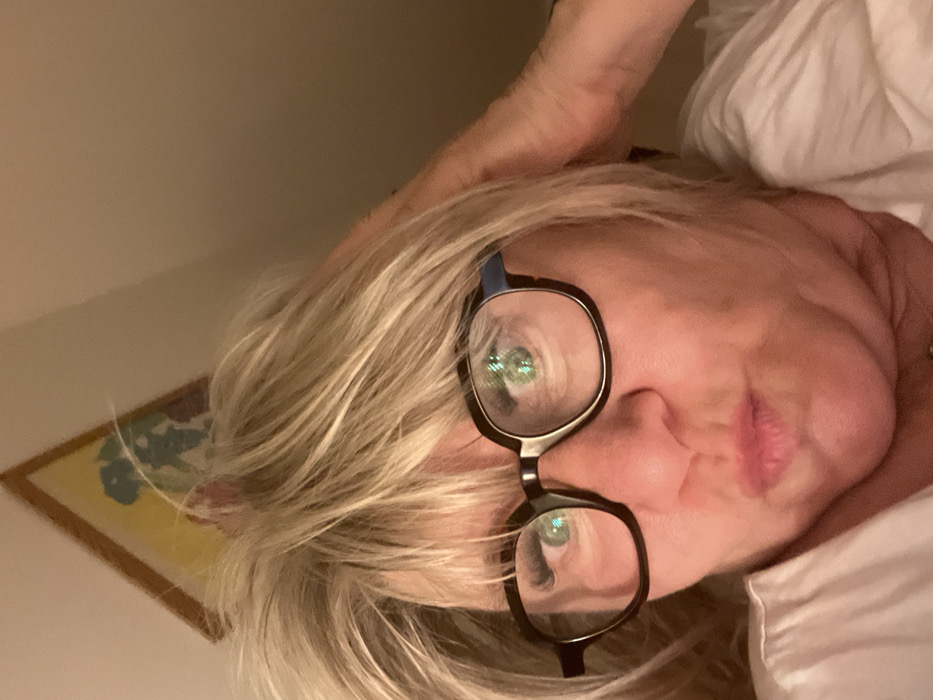 - "A woman with blonde hair and black-framed glasses lies sideways on a white bed or pillow" by FM-vTiXm2, licensed under CC BY 4.0