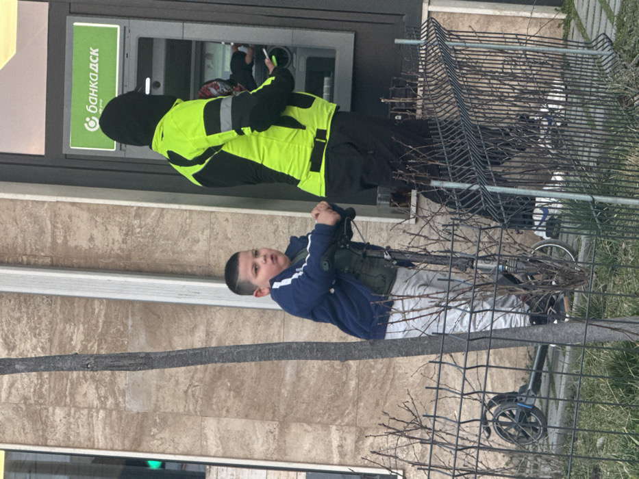 This image depicts an outdoor scene in Varna, Bulgaria, featuring a DSK Bank ATM. In the foreground, a low, black metal fence with vertical bars is visible, separating a patch of grass and dormant shrubs from the main area. A slender, light-barked tree trunk stands just behind the fence on the left. Two individuals are present. On the left, a young boy with short, dark hair featuring a shaved line on the right side of his head stands on a dark-colored kick scooter with blue accents on its wheels. He wears a dark blue zip-up hoodie with white stripes on the sleeves, a dark green undershirt, and light grey sweatpants. His hands are on the scooter's handlebars, and he is looking towards the right with a slightly open mouth. To the right, an adult figure is positioned with their back to the camera, actively interacting with a grey DSK Bank ATM. The ATM features a brightly illuminated green sign at the top displaying the "БАНКА ДСК" (Bank DSK) logo and text. The adult wears a black hooded jacket with prominent neon yellow-green panels and reflective stripes on the arms, black pants, and white sneakers with blue accents. Their hood is pulled up, obscuring the head. The person's left hand is near the ATM's card slot/screen, holding a light-colored object, possibly a card or phone. The background consists of a building facade with light brown, possibly tiled or stone, material. A vertical white fixture or pipe runs along the building's edge. Below the ATM, on what appears to be a ledge or windowsill, a glass or cup containing a dark liquid is visible. The lighting suggests daytime, possibly overcast or late afternoon.