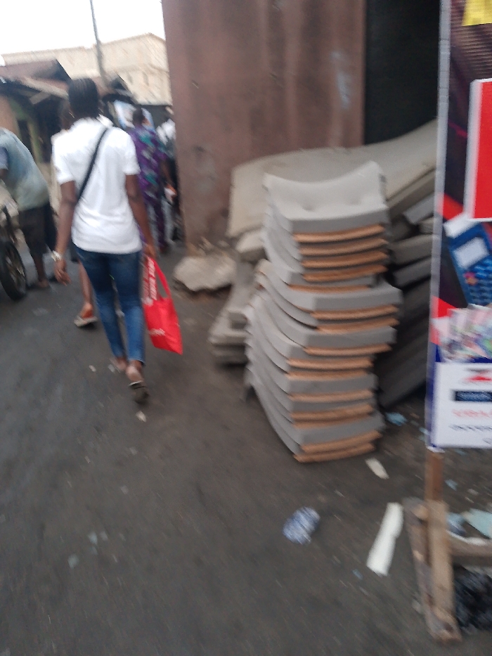 A stack of beige chair cushions are piled on a street next to a building. The street is paved and has litter scattered on it. A woman with a white shirt and blue jeans walks away from the camera, holding a red bag. Other people and a motorcycle are visible in the background, suggesting an urban or commercial area. A sign is to the right.
