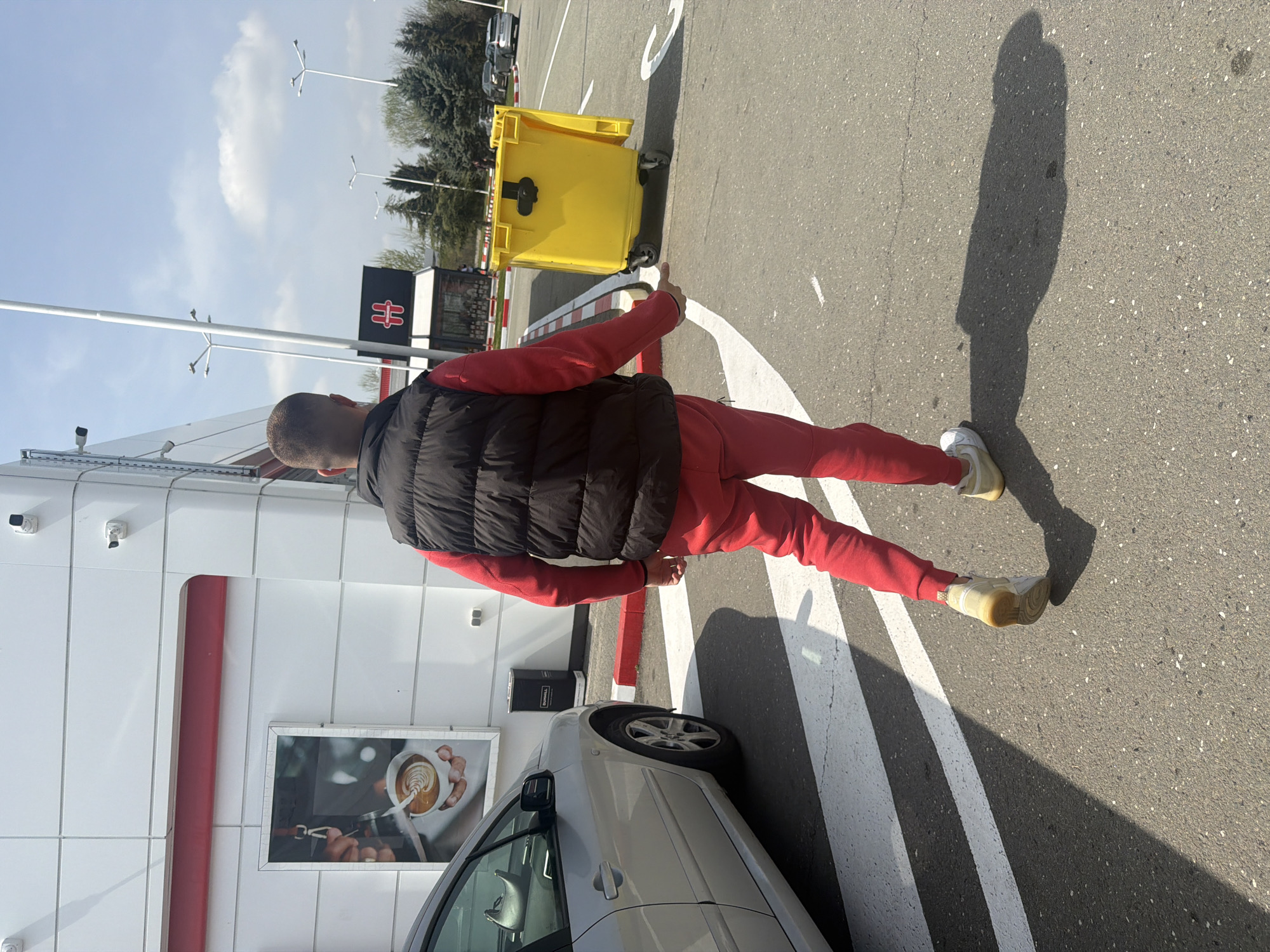 A medium shot, taken at an angle, depicts a man standing in a parking lot next to a car and a yellow trash bin. The man wears a red tracksuit and a black vest. He stands on a white-striped crosswalk. The car is silver and parked next to a building with a large picture of a coffee drink displayed. The building's facade is white with a red stripe. In the background, there is a street light, a building with a logo, and trees. The location is outdoors, seemingly in the city of Shtarkovo, Bulgaria. The man's shadow is visible on the asphalt.