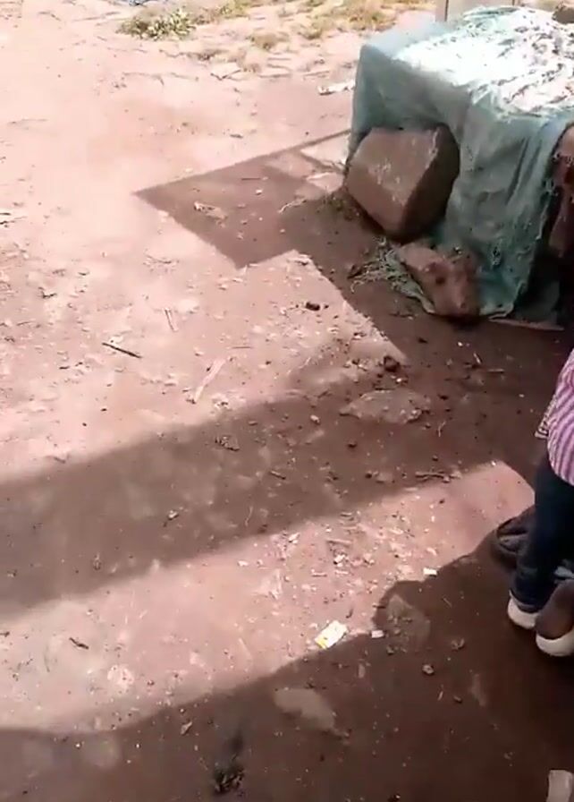 n outdoor scene on a mostly dirt surface. A small, rickety wooden table stands near a metal bucket. On the table are several tools, including knives and what appears to be a small hammer. A person's legs are briefly visible near the table. The camera pans across the scene, revealing various covered objects, a large rock, and a bicycle in the background. The environment suggests an outdoor workspace or storage area.