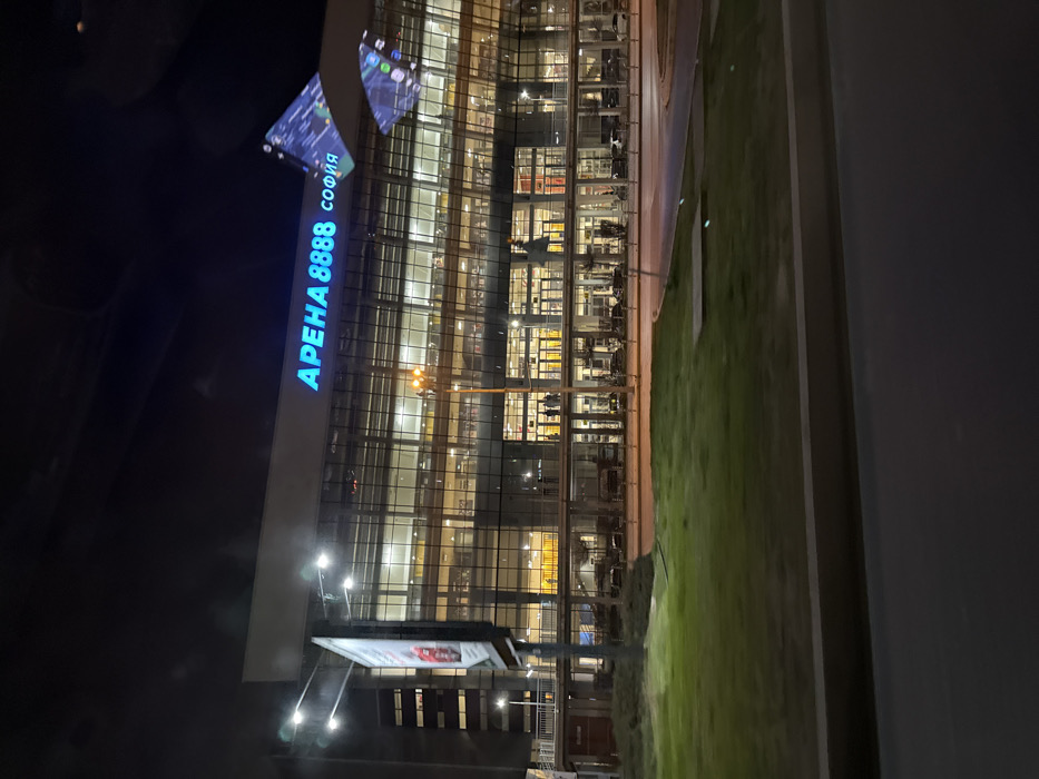 - "The image displays a nighttime view of a large, modern, multi-story building identified as "АРЕНА 8888 София" (ARENA 8888 Sofia) by prominent blue neon lettering on its upper facade" by FM-pmdhX2, licensed under CC BY 4.0
