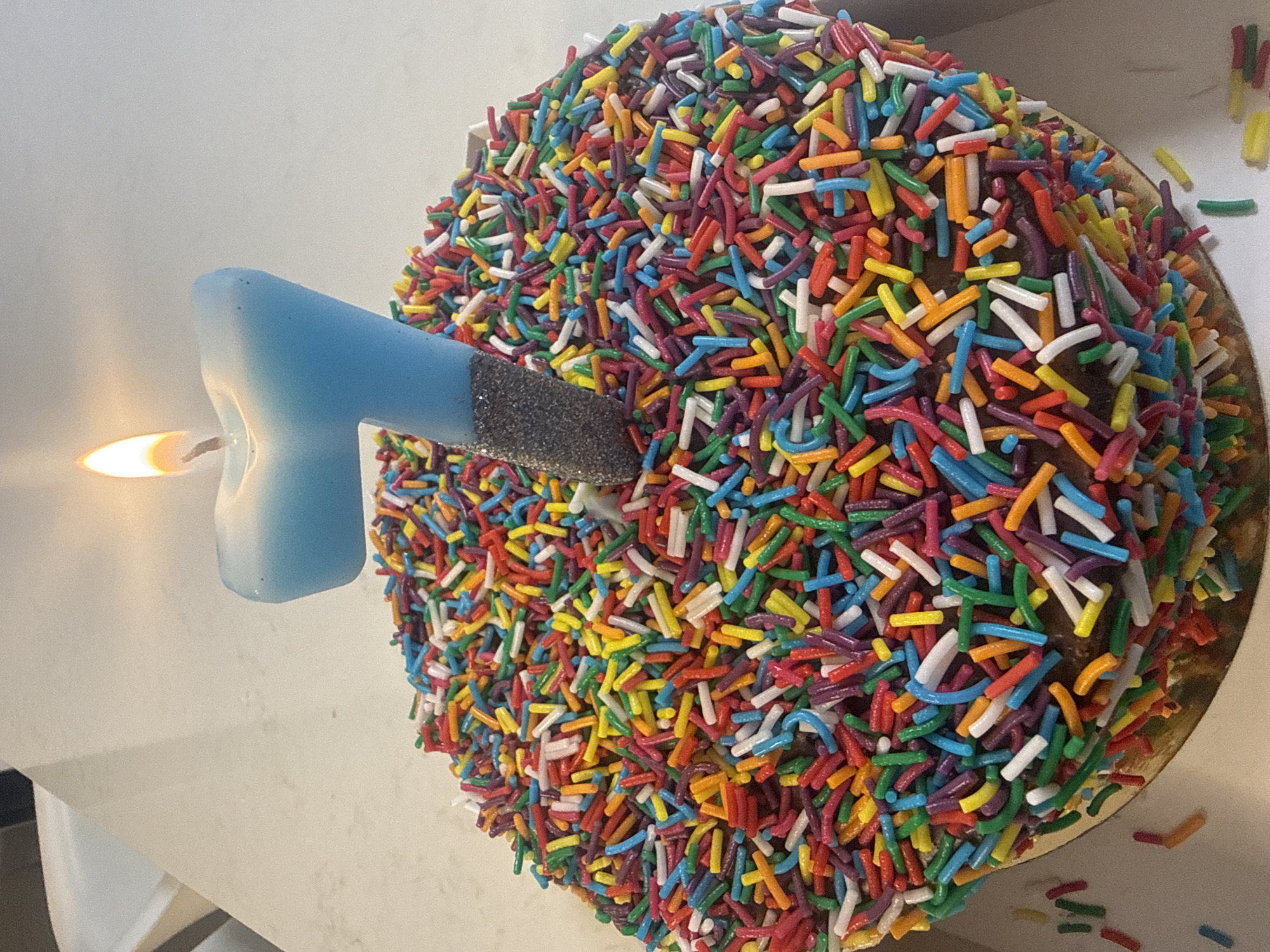 The image displays a round cake coated entirely in vibrant, multi-colored jimmie sprinkles, predominantly red, orange, yellow, green, blue, purple, pink, and white. A light blue, numeral '7' shaped candle, with a glittered dark grey base, is centrally inserted into the cake and is actively burning with an orange and yellow flame. The cake rests on a golden circular board, partially enclosed by a white cardboard box or container. Several loose sprinkles are scattered on the surrounding light-colored surface, likely a countertop. A portion of a light-toned chair or highchair is visible in the blurred background to the upper left. There are no people, direct actions, or interactions depicted. This scene is located in Tel-Aviv, Israel.