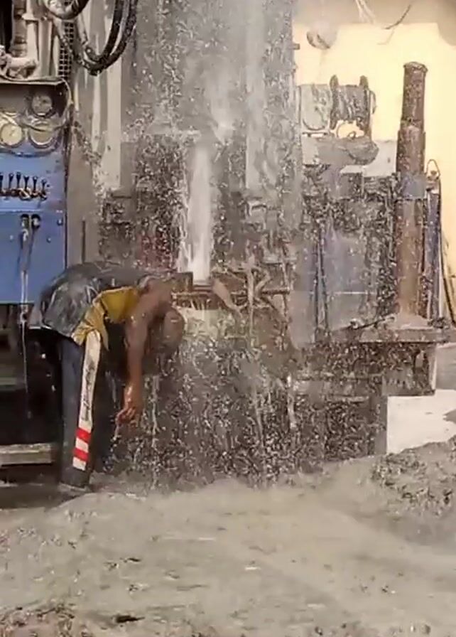 drilling machine being used to bore a hole in the ground. A man stands next to the machine, apparently working on it, as water shoots from the machine. The ground is muddy from the water and the machine is in a residential area near houses. Another man walks by to the right of the machine.