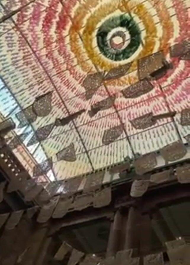 The video pans down in what appears to be a church or building with high ceilings. The ceiling is decorated with a colorful circular design with white paper cutouts hanging beneath it. Below, there is a large decorative display with candles, flowers, and statues. The display is draped with gold and pink fabric. There are stone columns visible in the background.