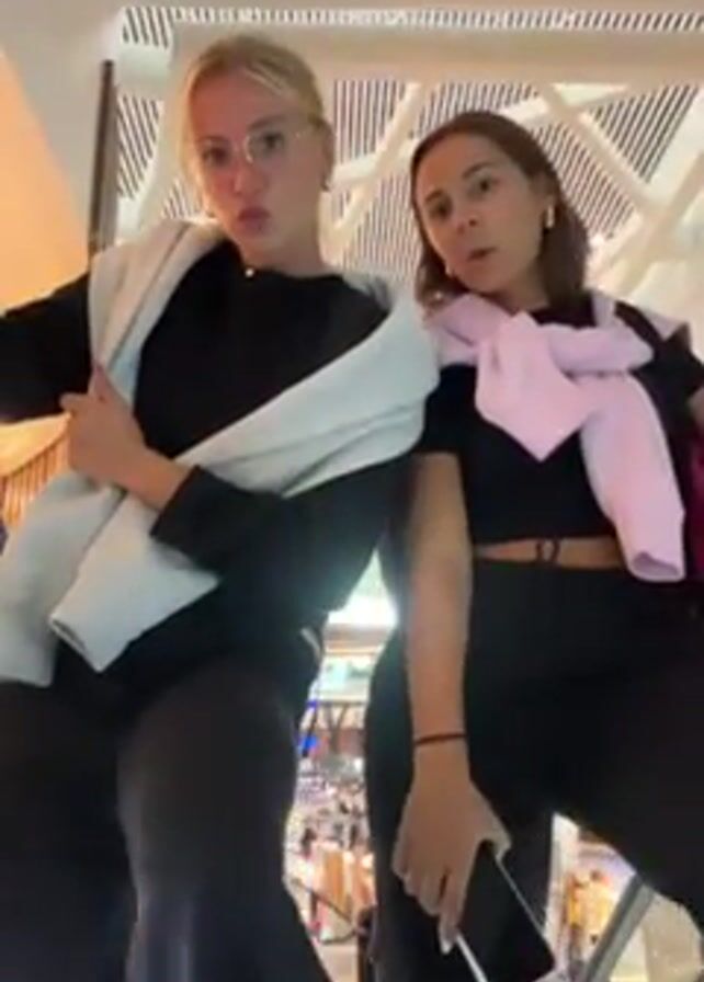 Two young women are standing on an escalator, posing for the camera. The woman on the left has blonde hair, glasses, and is wearing a black top, black pants, and a light gray sweater draped over her shoulders. She makes various faces at the camera, including sticking her tongue out. The woman on the right has brown hair, is wearing a black top, black pants, and a light pink sweater draped over her shoulders. She holds a phone in her hand. They are in a large, modern building with other people visible in the background.