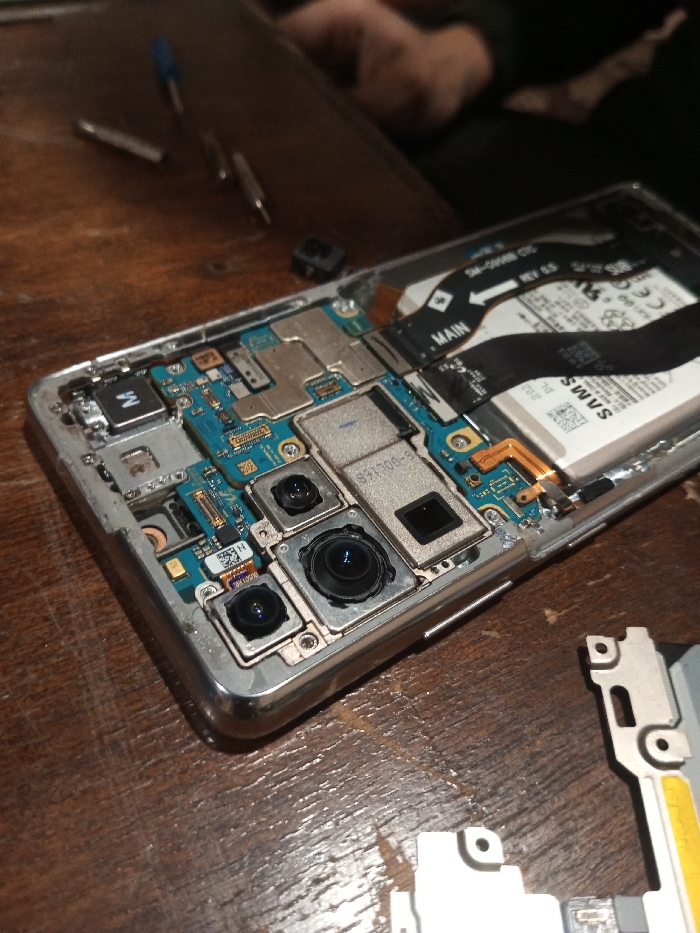 - "In Bagochen Boolingpang Ueling, Bhutan, a partially disassembled silver-framed smartphone, identified by internal markings as a Samsung model (SM-G998B CC), rests on a dark, scratched wooden surface" by FM-DhZcv1, licensed under CC BY 4.0
