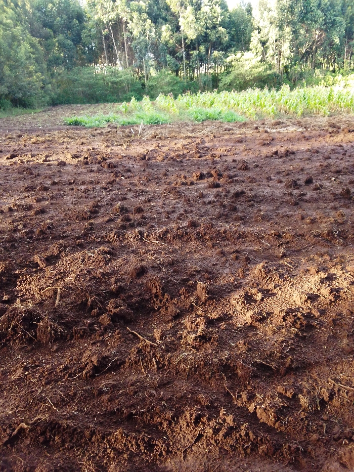 A cultivated agricultural field in Limuru, Kenya, is depicted under natural light, indicating a low sun angle