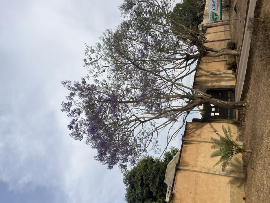 Two jacaranda trees with violet flowers grow adjacent to a peach-colored building, which is next to a grassy area. The trees' branches extend into a cloudy sky. A palm tree is planted beside the building. A sign with "ACRES" is visible on the building. The building has a black door.