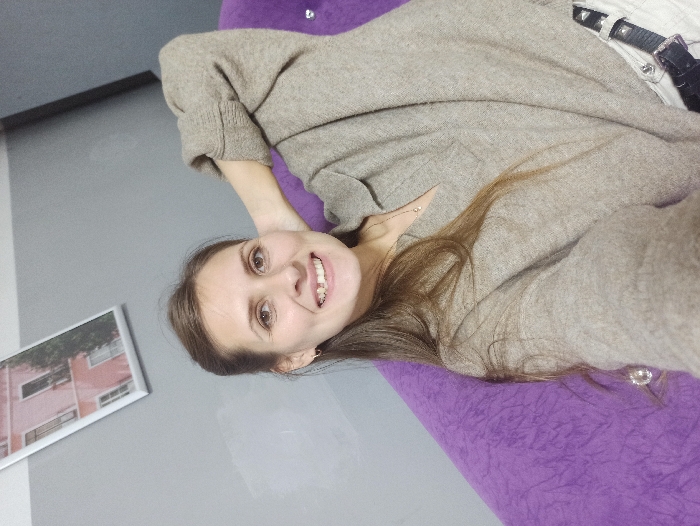 A female individual, appearing in her 20s or early 30s, is captured in an upward-angled selfie indoors. She possesses light brown hair, partially pulled back with strands falling forward, and fair skin. Her expression is a broad smile, revealing upper teeth with a distinct gap between the central incisors. She wears a loose-fitting, beige long-sleeved sweater with a v-neck and collar, small hoop earrings, and a delicate pendant necklace. Her right arm is bent with the hand positioned behind her head or neck in a relaxed pose. Visible below her sweater are portions of light-colored lower attire and a black belt with a silver buckle. She is seated or reclined on a textured purple upholstered surface, likely a sofa or armchair. The background features a plain light grey wall. A framed picture, depicting a multi-story building facade with windows and balconies in shades of pink, hangs on the wall to the upper left. The scene is an interior setting, described as being located in the city of Irkutsk, Russia.