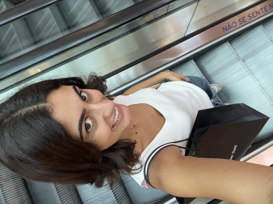 A female individual with dark brown, shoulder-length hair and dark eyes smiles directly at the camera while taking a selfie. She wears a white ribbed V-neck tank top, blue jeans, and light-colored casual shoes. A delicate necklace with small dark beads is visible around her neck, and multiple light-colored beaded bracelets adorn her left wrist. She holds a black shopping bag with "Massimo Dutti" branding in her right hand. She is standing on a moving escalator, which features metallic, ribbed steps and a dark brown handrail. To the right, a blue panel on the escalator displays the partial Portuguese warning text "NÃO SE SENTE" (Do Not Sit). The scene occurs within an indoor commercial setting, likely a shopping mall such as NorteShopping in Senhora da Hora, Portugal.