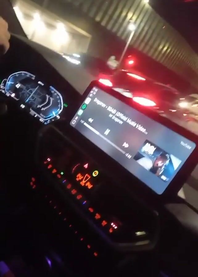 The interior of a car at night is filmed as it is driving along a road. The car’s digital dashboard shows a map in blue, while the screen next to it plays the music video for “3OAB (Official Music Video…)” by Mr. Drapanov on YouTube. The car’s climate control panel glows red. Through the windshield, we see streetlights and other vehicles in the darkness, as the car navigates around a circular turn.