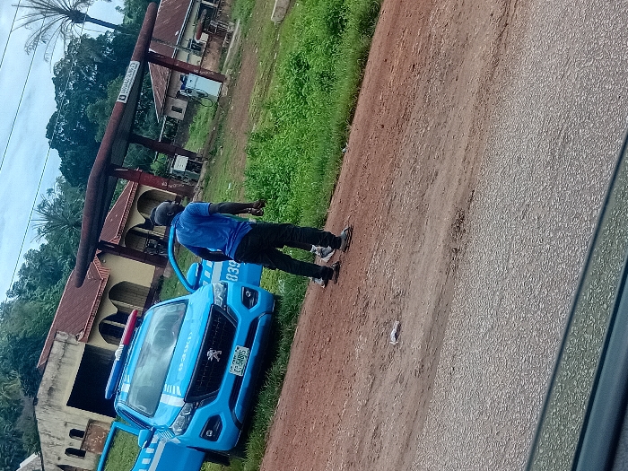 The image depicts an outdoor scene in Ochadam, Nigeria, on what appears to be a cloudy day. In the foreground, an asphalt road transitions into a dirt path on the right. A light blue Peugeot 3008 SUV, marked as a police or security vehicle with "039" on its side and license plate "LC 648YS," is parked on the dirt path with its front passenger door and driver's side rear door open. A red and blue light bar is mounted on its roof. Standing on the dirt path, with his back to the viewer, is a male individual wearing a blue short-sleeved shirt, dark trousers, and sandals, facing towards the background structures. The lower legs and feet of a second person are partially visible behind him. A crumpled white object lies on the dirt path near the road. In the mid-ground, beyond the vehicle and individuals, are multiple light-colored buildings with reddish-brown corrugated metal roofs, suggesting a state of disrepair. A prominent, elongated, reddish-brown cantilevered canopy, characteristic of a gas station, extends horizontally above at least two white fuel pumps. Dense green vegetation and trees form the background.