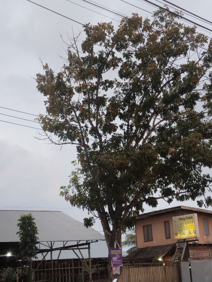 This image depicts an outdoor street scene in Keudebayu, Indonesia, under an overcast sky. A large, mature tree with a dense canopy of green and reddish-brown leaves occupies the central and upper-right portion of the frame. Several dark utility lines traverse the sky horizontally above the tree. To the left of the large tree, a building with a silver corrugated metal roof supported by a wooden framework is visible, partially illuminated by internal lighting. A smaller, slender tree stands in front of this structure. To the right of the large tree, a two-story building with a light brown facade and brown-framed windows is present. A prominent, illuminated yellow rectangular sign attached to this building displays the text "Kilang Kelapa UD. ALEAT JAYA" along with graphic elements depicting coconuts and coconut products. A wooden ladder leans against the building below the sign. A wooden fence runs along the ground level in front of this building. A vertical purple banner with white text is affixed to the trunk of the large central tree. A small, dark section of a vehicle, consistent with a motorcycle or scooter, is visible at the bottom center of the image. No individuals are present in the scene.